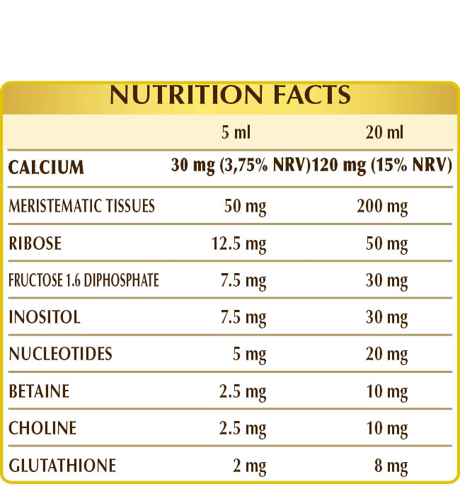 Bidistilled vegetable glycerine, pure water, calcium lactate; fresh meristematic tissues (1%): silver fir (Abies pectinata, synonym Abies alba) buds, dog-rose (Rosa canina) young shoots, silver linden (Tilia tomentosa) buds, vine (Vitis vinifera) buds; ribose, fructose 1.6 diphosphate; acidity regulator: lactic acid; inositol, betaine citrate, choline tartrate; nucleotide mix: AMP (adenosine monophosphate), CMP (cytosine monophosphate), GMP (guanosine monophosphate), UMP (uridine monophosphate); glutathione; natural sweetener: thaumatin (E957).