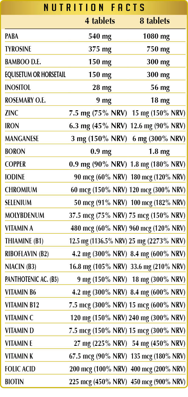 PABA (p-aminobenzoic acid), (L-)tyrosine, microcrystalline cellulose°, gum arabic°, bamboo (Bambusa vulgaris) young stems D.E. (70% titrated in silica), equisetum or horsetail (Equisetum arvense) herb powder, vitamin C (ascorbic acid), zinc gluconate, plant-derived vitamin E (D-α-tocopheryl acetate), ferrous gluconate, silicon dioxide°°, plant-based myo-inositol (extracted from corn seeds), manganese gluconate, vitamin B3 (nicotinamide), vitamin B1 (thiamine hydrochloride), plant-based magnesium stearate°°, vitamin B5 (calcium pantothenate), rosemary (Rosmarinus officinalis) flowering top E.O., sodium borate, activated vitamin B2 (sodium riboflavin-5-phosphate), activated vitamin B6 (pyridoxal-5-phosphate), copper gluconate, vitamin A (retinyl acetate), lichen (Cladonia rangiferina) thallus D.E. (titrated to vitamin D3 cholecalciferol 100,000 UI/g), chromium picolinate, biotin, activated folic acid (calcium L-methylfolate), potassium iodide, sodium selenite, sodium molybdate, vitamin K1 (phylloquinone), activated vitamin B12 (methylcobalamin, 5-deoxyadenosylcobalamin).