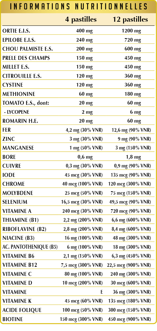 Food supplement made from herbs, minerals, vitamins, and other nutrients. Nettle, horsetail and millet support healthy hair. In particular, zinc, selenium and biotin maintain healthy hair whereas copper contributes to its normal pigmentation. Zinc supports normal testosterone levels in the blood and, in combination with copper, iodine and vitamins A, B2, B3, C and biotin, helps maintain healthy skin. In addition, nettle, fireweed, saw palmetto, pumpkin and tomato, rich in lycopene, contribute to normal function of the prostate gland.