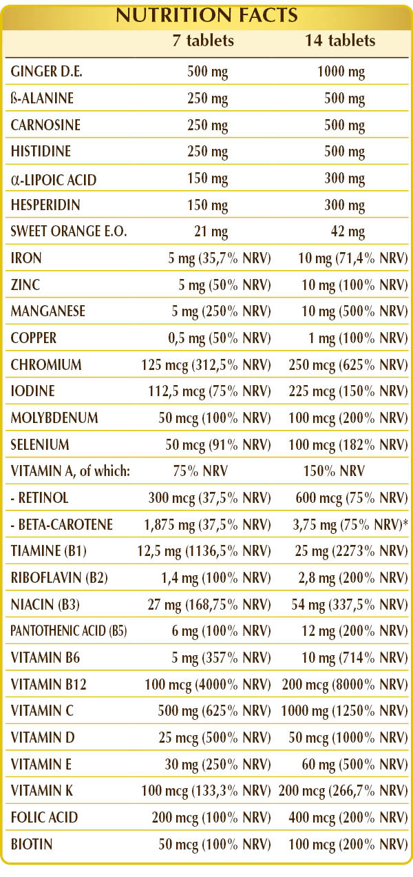 Ginger (Zingiber officinalis) rhizome D.E. (standardized to 5% gingerols), vitamin C (ascorbic acid), microcrystalline cellulose°, gum arabic°, ß-alanine, (L-)carnosine, (L-)histidine, R-α-lipoic acid, citrus bioflavonoids (hesperidin), silicon dioxide°°, plant-derived vitamin E (D-α-tocopheryl acetate), ferrous gluconate, manganese gluconate, zinc gluconate, vitamin B3 (nicotinamide); natural flavor: sweet orange (Citrus aurantium var. sinensis or dulcis) fruit peel E.O.; dunaliella (Dunaliella salina) thallus (algae) D.E. (standardized to 10% beta-carotene), vitamin B1 (thiamine hydrochloride), plant-derived magnesium stearate°°, lichen (Cladonia rangiferina) thallus D.E. (standardized in vitamin D3 (cholecalciferol) 100,000 IU/g), activated vitamin B6 (pyridoxal-5-phosphate), vitamin B5 (calcium pantothenate), copper gluconate, activated vitamin B2 (riboflavin 5’-phosphate sodium), vitamin A (retinyl acetate), chromium picolinate, activated folic acid (L-methylfolate calcium), potassium iodide, sodium molybdate, sodium selenite, activated vitamin B12 (5-deoxyadenosylcobalamin, methylcobalamin), vitamin K1 (phylloquinone), biotin. °Bulking agent °°Anti-caking agent