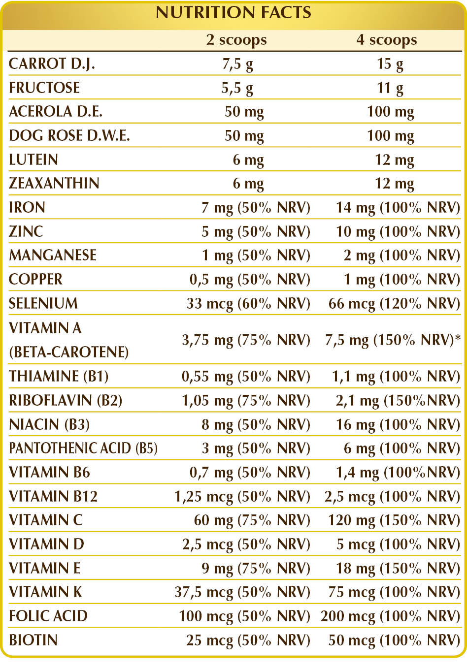 Carrot (Daucus carota) root D.J., fructose, corn or rice-based maltodextrins, marigold (Tagetes erecta) flower heads D.E. (standardized to 10% lutein), marigold (Tagetes erecta) flower head D.E. (standardized to 10% in zeaxanthin), acerola (Malpighia glabra) fruit D.E. (standardized to 50% in vitamin C), dog rose (Rosa canina) fruit W.D.E. (standardized to 70% vitamin C), ferric ammonium citrate, zinc gluconate, Dunaliella (Dunaliella salina) thallus (alga) D.E. (standardized to 10% beta-carotene), plant-derived vitamin E (D-α-tocopheryl acetate), manganese gluconate, vitamin B3 (nicotinamide), copper gluconate, vitamin B5 (calcium pantothenate), activated vitamin B2 (sodium riboflavin-5-phosphate), lichen (Cladonia rangiferina) thallus D.E. (standardized to vitamin D3 cholecalciferol 100,000 IU/g), activated vitamin B6 (Pyridoxal-5-phosphate), vitamin B1 (thiamine hydrochloride), activated folic acid (L-methylfolate calcium), sodium selenite, vitamin K1 (phylloquinone), biotin, activated vitamin B12 (5-deoxyadenosylcobalamin, methylcobalamin).