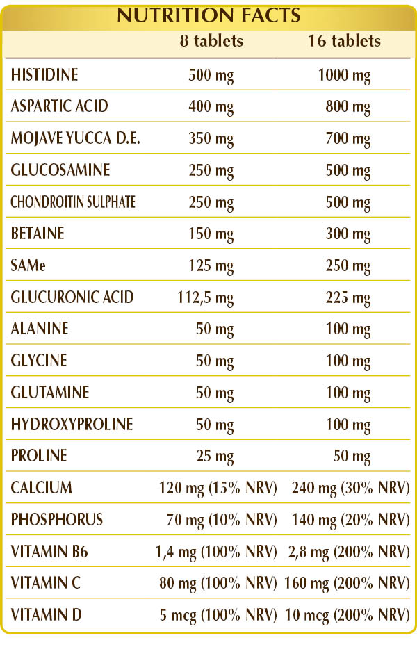 (L-)histidine, D-glucosamine sulfate (from fermentation), (L-)aspartic acid, dibasic calcium phosphate, yucca (Yucca schidigera) herb D.E. (standardized to 60% saponins), microcrystalline cellulose°, gum arabic°, chondroitin sulfate (from bovine), SAMe (S-adenosyl methionine disulfate tosylate), betaine, silicon dioxide°°, sodium glucuronate, vitamin C (ascorbic acid), calcium carbonate, vegetable-derived magnesium stearate°°, (L-)alanine, glycine, (L-)glutamine, (L-)hydroxyproline, (L-)proline, activated vitamin B6 (pyridoxal-5-phosphate), lichen (Cladonia rangiferina) thallus D.E. (standardized to vitamin D3 cholecalciferol 10,000 UI/g), sodium molybdate. °Bulking agent