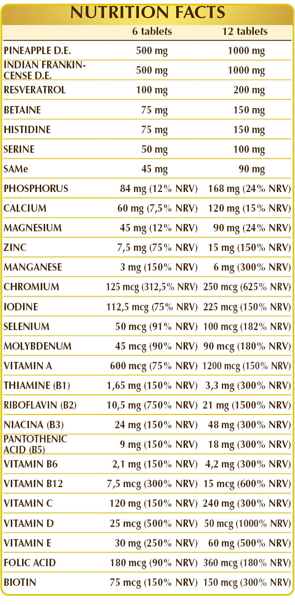 Pineapple (Ananas comosus) fruit stem D.E. (bromelain 2500 GDU/g), boswellia (Boswellia serrata) gum resin D.E. (standardized to 65% boswellic acids), microcrystalline cellulose°, gum arabic°, dibasic calcium phosphate, magnesium glycerophosphate, vitamin C (ascorbic acid), plant-derived resveratrol, SAMe (S-adenosyl methionine disulfate tosylate), betaine, (L-)histidine, plant-derived vitamin E (D-α-tocopheryl acetate), silicon dioxide°°, zinc gluconate, (L-)serine, magnesium oxide, manganese gluconate, vitamin B3 (nicotinamide), plant-derived magnesium stearate°°, activated vitamin B2 (sodium riboflavin-5-phosphate), lichen (Cladonia rangiferina) thallus E.S. (standardized to Vitamin D3 cholecalciferol 100,000 IU/g), vitamin B5 (calcium pantothenate), copper gluconate, vitamin A (retinyl acetate 500,000 IU/g), activated vitamin B2 (riboflavin 5-phosphate sodium), activated vitamin B6 (pyridoxal-5-phosphate), vitamin B1 (thiamine hydrochloride), chromium picolinate, activated folic acid (L-methylfolate calcium), potassium iodide, sodium selenite, sodium molybdate, biotin, vitamin K1 (phylloquinone), activated vitamin B12 (5-deoxyadenosylcobalamin, methylcobalamin).