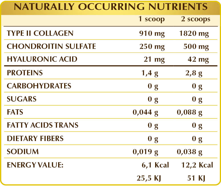 Type II collagen from hydrolyzed chicken cartilage powder (52%), maltodextrins from corn or rice.