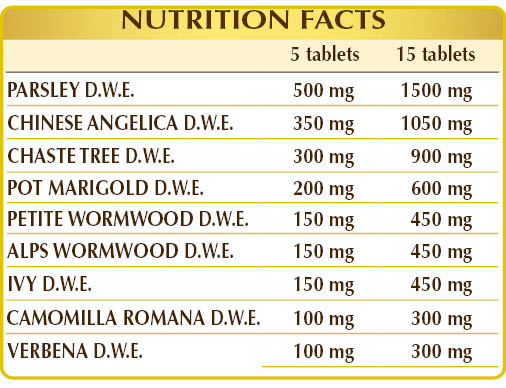 Parsley (Petroselinum crispum) fruit W.D.E., Dong quai (Angelica sinensis) root W.D.E., chaste tree (Vitex agnus-castus) fruit W.D.E., microcrystalline cellulose°, gum Arabic°, pot marigold (Calendula officinalis) flower head W.D.E., petite wormwood (Artemisia pontica) flowering herb W.D.E., Alps wormwood (Artemisia vallesiaca) flowering herb W.D.E., ivy (Hedera helix) leaf W.D.E., Roman chamomile (Anthemis nobilis) flower head W.D.E., vervain (Verbena officinalis) flowering herb W.D.E., silicon dioxide°°, plant-based magnesium stearate°°.