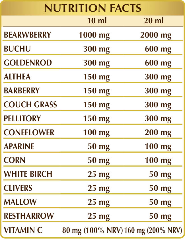 Bearberry, buchu, golden rod, couchgrass, pellitory, cleavers, corn, white birch and gallium support body fluid drainage and the urinary tract function. Marshmallow, mallow and restharrow exert an emollient and soothing action on the urinary tract whereas coneflower and vitamin C support the body's natural barriers.