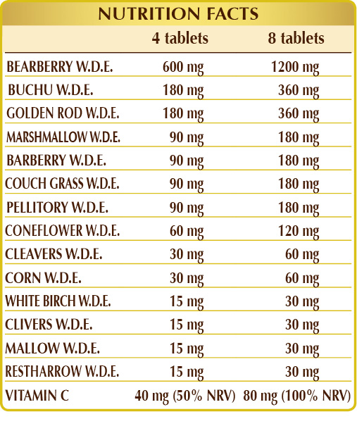 Bearberry (Arctostaphylos uva-ursi) leaf D.W.E., buchu (Barosma betulina) leaf D.W.E., golden rod (Solidago virga-aurea) flowering herb D.W.E., microcrystalline cellulose°, gum arabic°, marshmallow (Althaea officinalis) root D.W.E., barberry (Berberis vulgaris) root bark D.W.E., couch grass (Agropyron repens) rhizomes D.W.E., pellitory (Parietaria officinalis) herb D.W.E., coneflower (Echinacea angustifolia, pallida and purpurea) root D.W.E., potassium ascorbate, potassium carbonate, aparine (Galium aparine) flowering herb D.W.E., corn or maize (Zea mays) stigma D.W.E., silicon dioxide°°, white birch (Betula alba or pubescens) leaf D.W.E., gallium (Galium verum) flowering herb D.W.E., mallow (Malva sylvestris) leaf D.W.E., restharrow (Ononis spinosa) root D.W.E., plant-based magnesium stearate°°.