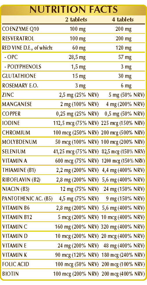 Dibasic calcium phosphate, vitamin C (ascorbic acid), microcrystalline cellulose°, gum arabic°, coenzyme Q10, plant-derived resveratrol, plant-derived vitamin E (D-α-Tocopheryl Acetate), red grapevine (Vitis vinifera) leaf D.E. (standardized to 5% polyphenols), red grapevine (Vitis vinifera) seed D.E. (standardized to 95% oligomeric proanthocyanidins or OPC), zinc gluconate, silicon dioxide°°, manganese gluconate, reduced glutathione, vitamin B3 (nicotinamide), vitamin B5 (calcium pantothenate), activated vitamin B2 (sodium riboflavin-5-phosphate), plant-based magnesium stearate°°, activated vitamin B6 (pyridoxal-5-phosphate), lichen (Cladonia rangiferina) thallus D.E. (standardized to vitamin D3 cholecalciferol 100,000 IU / g), vitamin B6 (pyridoxine hydrochloride), rosemary (Rosmarinus officinalis) flowering top E.O., vitamin B1 (thiamine hydrochloride), vitamin B2 (riboflavin), copper gluconate, chromium picolinate, potassium iodide, sodium molybdate, folic acid, biotin, sodium selenite, vitamin K1 (phylloquinone), vitamin B12 (cyanocobalamin). °Bulking agent °°Anti-caking agent