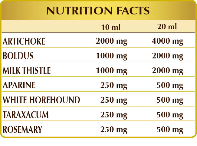 Bidistilled vegetable glycerine, pure water, artichoke (Cynara scolymus) leaf W.L.E., boldo (Peumus boldus) leaf W.L.E., milk thistle (Silybum marianum) fruit W.L.E., white horehound (Marrubium vulgare) flowering herb W.L.E., dandelion (Taraxacum officinale) root W.L.E., cleavers (Galium aparine) flowering herb W.L.E., rosemary (Rosmarinus officinalis) leaf W.L.E.