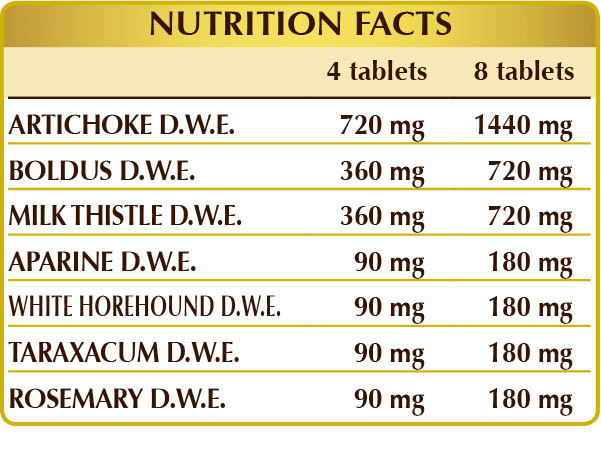 Artichoke (Cynara scolymus) leaf W.D.E., boldo (Peumus boldus) leaf W.D.E., milk thistle (Silybum marianum) fruit W.D.E., microcrystalline cellulose°, gum arabic°, white horehound (Marrubium vulgare) flowering herb W.D.E., dandelion (Taraxacum officinale) root W.D.E., cleavers (Galium aparine) flowering herb W.D.E., rosemary (Rosmarinus officinalis) leaf W.D.E., silicon dioxide°°, plant-based magnesium stearate°°.