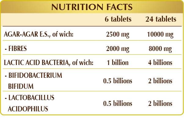 Agar-agar is a soluble fibre that is not digested nor absorbed by the gut; it helps keep the intestine clean, supporting regular bowel movements and normalising the compactness and volume of faecal material. Probiotic lactic acid bacteria can be useful in maintaining healthy gut flora balance.