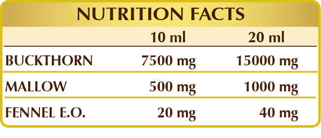 Alder buckthorn (Rhamnus frangula) bark W.L.E., mallow (Malva sylvestris) leaf W.L.E., bi-distilled vegetable glycerine, pure water, fennel (Foeniculum vulgare) fruit E.O.; natural sweeteners: steviol glycosides, thaumatin.