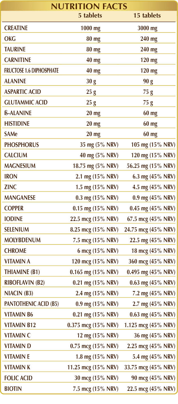 Creatine monohydrate, microcrystalline cellulose°, gum arabicum, dibasic calcium phosphate, taurine, (L-)ornithine α-ketoglutarate (OKG), creatine phosphate, acetyl (L-)carnitine hydrochloride, silicon dioxide°°, calcium glycerophosphate, fructose 1,6-diphosphate, SAMe (S-adenosyl methionine disulfate tosylate), (L-)alanine, magnesium glycerophosphate, magnesium oxide, (L-)aspartic acid, (L-)glutamic acid, ß-alanine, (L-)histidine, iron gluconate, potassium ascorbate, plant-based magnesium stearate°°, zinc gluconate, vegetable source vitamin E (D-α-tocopheryl acetate), vitamin B3 (inositol hexanicotinate), manganese gluconate, copper gluconate, vitamin B5 (calcium pantothenate), vitamin A (retinyl acetate), activated vitamin B2 (sodium riboflavin-5-phosphate), activated vitamin B6 (pyridoxal-5-phosphate), lichen (Cladonia rangiferina) thallus D.E. (standardized to vitamin D3 cholecalciferol 100,000 IU/g), vitamin B1 (thiamine hydrochloride), chromium picolinate, activated folic acid (calcium L-methylfolate), potassium iodide, sodium molybdate, sodium selenite, vitamin K1 (phyloquinone), biotin, activated vitamin B12 (5-deoxyadenosylcobalamin, methylcobalamin).. D.E.= Dehydrated Extract °Bulking agent °°Anti-caking agent