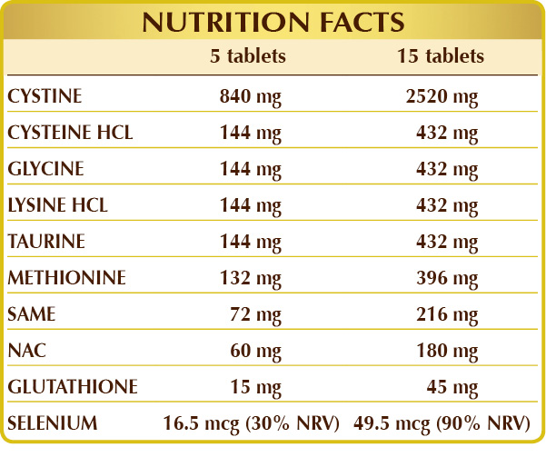 (L-)cystine, microcrystalline cellulose°, gum arabic°, (L-)cysteine HCL or hydrochloride, glycine, (L-)lysine HCL or hydrochloride, SAMe (S-adenosylmethionine disulfate tosylate), taurine, (L-)methionine, NAC (N-acetylcysteine), silicon dioxide°°, reduced glutathione, plant-based magnesium stearate°°, (L-)selenomethionine.