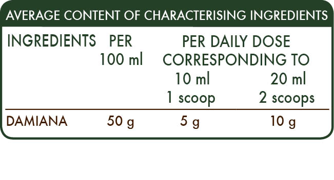 Alcohol-free whole liquid extract obtained from: bi-distilled vegetable glycerine, pure water, Damiana (Turnera diffusa) leaves.