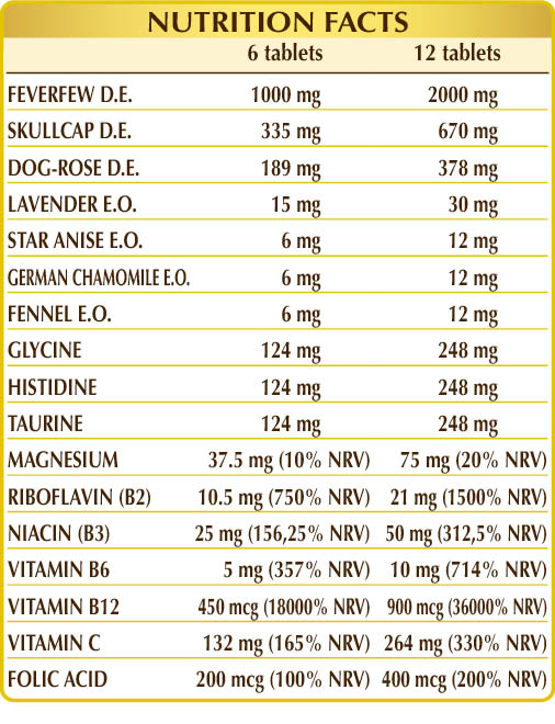 Feverfew or Chrysanthemum Parthenium (Tanacetum Parthenium) headflower D.E. (titrated to 0.8% parthenolide), skullcap (Scutellaria baicalensis) root D.E. (titrated to 30% baicalin), magnesium glycerophosphate, microcrystalline cellulose°, gum arabic°, dog rose (Rosa canina) fruit D.E. (titrated to 70% vitamin C), glycine, (L-)histidine, taurine, silicon dioxide°°, vitamin B3 (inositol hexanicotinate), plant-based magnesium stearate°°, activated vitamin B2 (riboflavin 5-sodium phosphate), magnesium oxide, lavender (Lavandula officinalis) flowering top E.O., activated vitamin B6 (pyridoxal-5-phosphate), star anise (Illicium verum) fruit E.O., German chamomile (Matricaria chamomilla) flower head E.O., fennel (Foeniculum vulgare) fruit E.O., activated vitamin B12 (methylcobalamin, 5-deoxyadenosylcobalamin), activated folic acid (calcium L-methylfolate). °Bulking agent °°Anti-caking agent