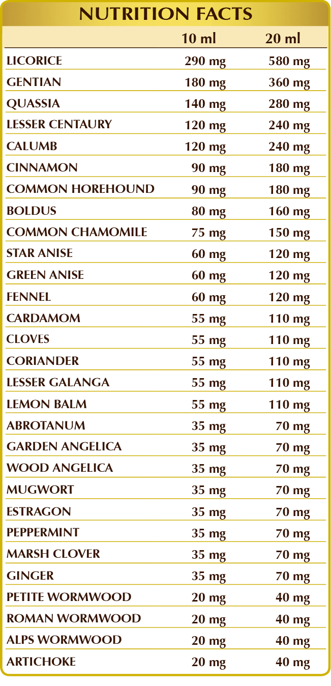 Pure water, ethyl alcohol (Alcoolvis®= Alcohol purified by Dr Martino Giorgini’s method), licorice (<em>Glycyrrhiza glabra</em>) root W.L.E., gentian (<em>Gentiana lutea</em>) root W.L.E., quassia (<em>Quassia amara</em>) wood W.L.E., common centaury (<em>Centaurium erythraea</em>) top W.L.E., Calumb (<em>Jateorhiza palmata</em>) root W.L.E, cinnamon (<em>Cinnamomum zeylanicum</em>) bark W.L.E., common horehound (Marrubium vulgare) flowering herb W.L.E., boldo (<em>Peumus boldus</em>) leaf W.L.E., common chamomile (<em>Matricaria chamomilla</em>) flower head W.L.E., star anise (<em>Illicium verum</em>) fruit W.L.E, green anise (<em>Pimpinella anisum</em>) fruit W.L.E, fennel (<em>Foeniculum vulgare</em>) fruit W.L.E., cardamom (<em>Elettaria cardamomum</em>) seed W.L.E., clove (<em>Eugenia caryophyllata</em>) flower bud W.L.E., coriander (<em>Coriandrum sativum</em>) fruit W.L.E., lesser galangal (<em>Alpinia officinarum</em>) rhizome W.L.E., lemon balm (<em>Melissa officinalis</em>) leaf W.L.E., southernwood (<em>Artemisia abrotanum</em>) top W.L.E., garden angelica (<em>Angelica archangelica</em>) root W.L.E., wood Angelica (<em>Angelica sylvestris</em>) root W.L.E., mugwort (<em>artemisia vulgaris</em>) root W.L.E., estragon (<em>Artemisia dracunculus</em>) leaf W.L.E., peppermint (<em>Mentha piperita</em>) leaf W.L.E., marsh clover (<em>Menyanthes trifoliata</em>) leaf W.L.E., ginger (<em>Zingiber officinalis</em>) rhizome W.L.E., petite wormwood (<em>Artemisia pontica</em>) flowering herb W.L.E., grande wormwood or Roman wormwood (<em>Artemisia absinthium</em>) flowering herb W.L.E., Alps wormwood (<em>Artemisia vallesiaca</em>) flowering herb W.L.E., artichoke (<em>Cynara scolymus</em>) leaf W.L.E.