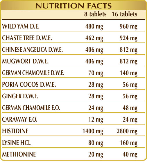(L-)histidine, wild yam (Dioscorea opposita) root D.E. (titrated to 16% diosgenin), chaste tree (Vitex agnus castus) fruit D.W.E., Don quai (Angelica sinensis) root D.W.E., mugwort (Artemisia vulgaris) flowering herb D.W.E., microcrystalline cellulose°, gum arabic°, (L-)lysine HCL or hydrochloride, German chamomile (Matricaria chamomilla) flower head D.W.E., silicon dioxide°°, plant-based magnesium stearate°°, cocos mushroom (Poria cocos) sclerotium (fungus) D.W.E., ginger (Zingiber officinalis) rhizome D.W.E., German chamomile (Matricaria chamomilla) flower head E.O., (L-)methionine, caraway or meadow cumin (Carum carvi) fruit E.O.