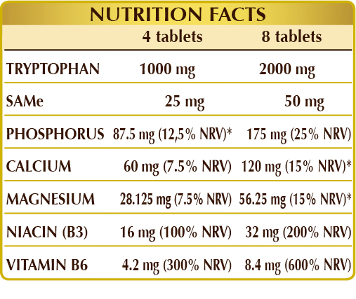 Food supplement containing tryptophan, herbs and other nutrients. Vitamins B3, B6 and magnesium contribute to the nervous system function and maintain normal psychological functions.