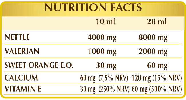 Bidistilled vegetable glycerin, purified water, nettle (Urtica dioica) top W.L.E., valerian (Valeriana officinalis) root W.L.E., calcium lactate, vitamin E (DL-α-tocopheryl acetate); natural flavour: sweet orange (Citrus aurantium var. sinensis or dulcis) fruit peel E.O.; natural sweeteners: steviol glycosides from stevia, thaumatin.