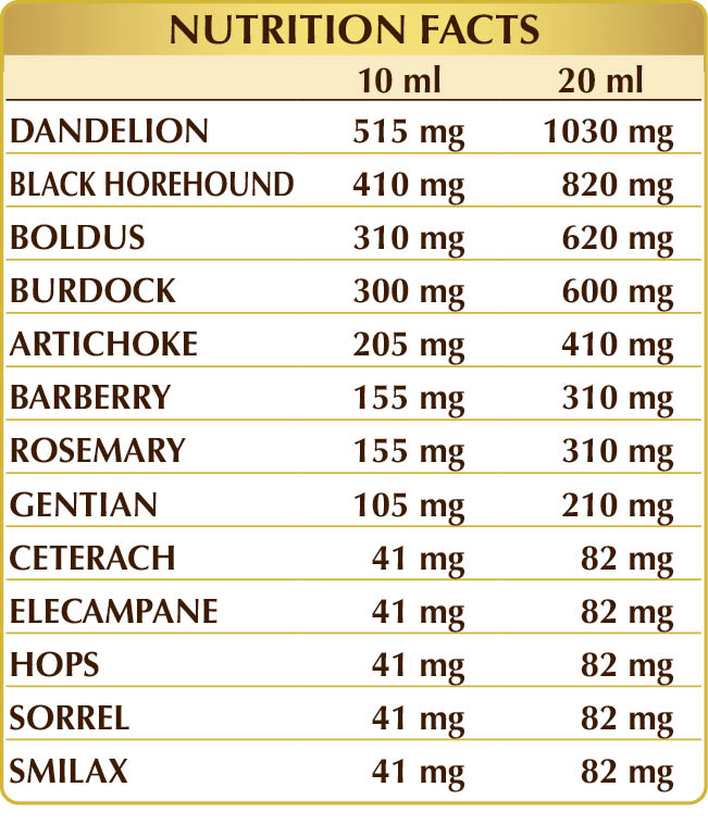 Dandelion, boldo, artichoke, barberry, rosemary and gentian support normal liver function. Horehound, elecampane and hops maintain normal digestive function, whereas yellow dock, smilax and burdock support the body's natural cleansing functions.