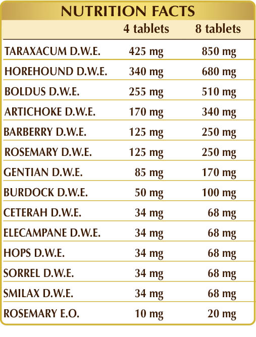 Dandelion, boldo, artichoke, barberry, rosemary and gentian support normal liver function. Horehound, elecampane and hops maintain normal digestive function, whereas yellow dock, smilax and burdock support the body's natural cleansing functions.