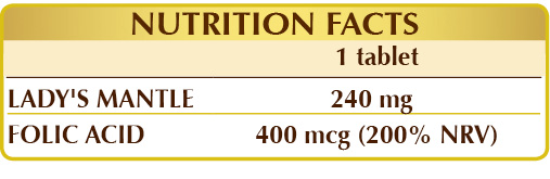 Food supplement based on folic acid and lady's mantle. For women of childbearing age, in anticipation of a pregnancy, supplemental intake of folic acid is useful for increasing maternal folate levels, which, if low, are a risk factor for the development of neural tube defects in the foetus*; it also contributes to the growth of maternal tissues. More generally, folic acid takes part in the process of cell division, helps strengthen the immune system, reduce tiredness and fatigue and maintain normal psychological function. Furthermore, it is involved in the synthesis of amino acids, in homocysteine metabolism and in haematopoiesis, i.e. the formation and maturation of all blood cells.