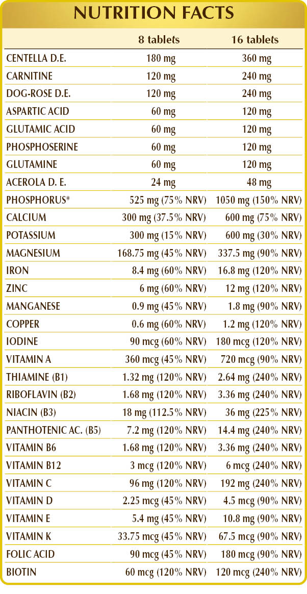 Magnesium glycerophosphate, calcium phosphate dibasic, potassium phosphate dibasic, microcrystalline cellulose°, gum arabic°, Asian coinleaf (Centella asiatica) herb D.E. (standardized to 20% triterpenic derivatives), acetyl (L-)carnitin HCL or hydrochloride, dog rose (Rosa canina) fruit D.E. (standardized to 70% vitamin C), silicon dioxide°°, (L-)aspartic acid, (L-)glutamic acid, (DL-)phosphoserine, (L-)glutamine, ferric ammonium citrate, calcium carbonate, zinc gluconate, magnesium oxide, acerola (Malpighia glabra) fruit D.E. (standardized to 50% vitamin C), plant-based magnesium stearate°°, vitamin E of vegetable origin (D-α-tocopheryl acetate), vitamin B5 (calcium pantothenate), manganese gluconate, copper gluconate, activated vitamin B2 (riboflavin 5-phosphate sodium), activated vitamin B6 (pyridoxal 5-phosphate), vitamin A (retinyl acetate), vitamin B1 (thiamine hydrochloride), lichen, lichen (Cladonia rangiferina) thallus D.E. (standardized to vitamin D3 cholecalciferol 100,000 IU/g, activated folic acid (calcium L-methylfolate), potassium iodide, biotin, vitamin K1 (phylloquinone), activated vitamin B12 (5-deoxyadenosylcobalamin, methicobalamin).