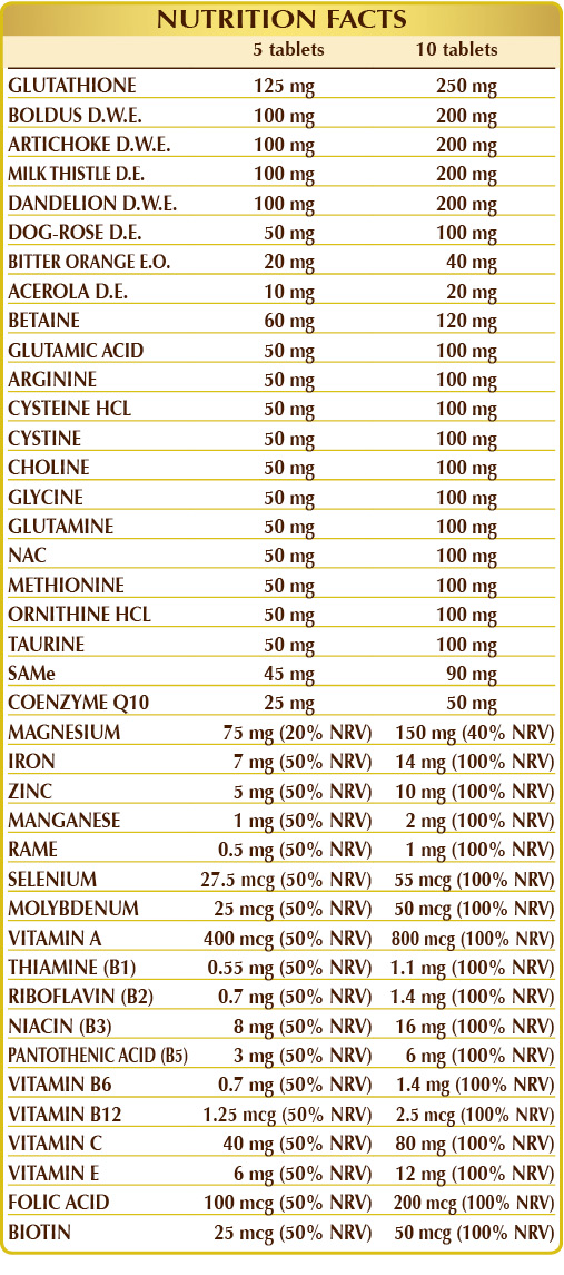 Microcrystalline cellulose°, gum arabic°, reduced glutathione, magnesium oxide, choline tartrate, boldo (Peumus boldus) leaf W.D.E., artichoke (Cynara scolymus) leaf W.D.E., milk thistle (Silybum marianum) fruit D.E. (standardized to 80% silymarin), dandelion (Taraxacum officinale) root W.D.E., silicon dioxide°°, SAMe (S-Adenosyl-L-Methionine (SAMe), ferrous gluconate, betaine, (L-)glutamic acid, (L-)arginine, (L-)cysteine HCL or hydrochloride, (L-)cystine, glycine, (L-)glutamine, NAC (N-acetylcysteine), (L-)methionine, (L-)ornithine HCL or hydrochloride, dog rose (Rosa canina) fruit W.D.E. (standardized to 70% vitamin C), taurine, zinc gluconate, coenzyme Q10; natural flavour: sweet orange (Citrus aurantium var. sinensis or dulcis) fruit peel E.O.; plant-derived vitamin E (D-α-tocopheryl acetate), plant-based magnesium stereate°°, acerola (Malpighia glabra) fruit D.E. (standardized to 50% in vitamin C), vitamin B3 (nicotinamide), manganese gluconate, copper gluconate, vitamin B5 (calcium pantothenate), vitamin A (retinyl acetate), activated vitamin B2 (riboflavin 5-phosphate sodium), activated vitamin B6 (pyridoxal 5-phosphate), vitamin B1 (thiamine hydrochloride), activated folic acid (L-methylfolate calcium), sodium molybdate, sodium selenite, biotin, activated vitamin B12 (5-deoxyadenosylcobalamin, methylcobalamin). °Bulking agent °°Anti-caking agent