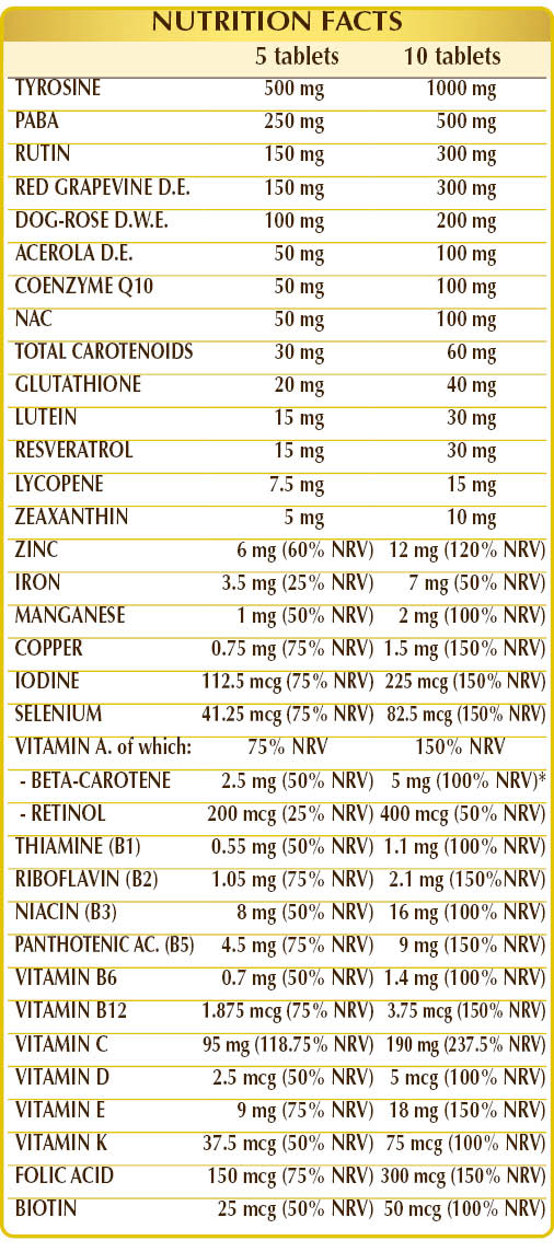 (L-)tyrosine (from fermentation), microcrystalline cellulose°, gum arabic°, PABA (para-aminobenzoic acid), marigold (Tagetes erecta) flower head D.E. (standardized to 10% lutein), vegetable rutin, red grapevine (Vitis vinifera) seed D.E. (standardized to 95% oligomeric proanthocyanidins), dog rose (Rosa canina) fruit W.D.E. (standardized to 70% vitamin C), tomato (Solanum lycopersicum) fruit D.E. (standardized to 10% lycopene), acerola (Malpighia glabra) fruit D.E. (standardized to 50% vitamin C), coenzyme Q10, NAC (N-acetylcysteine), marigold (Tagetes erecta) flower head D.E. (standardized to 10% zeaxanthin), zinc gluconate, silicon dioxide,°° ferrous gluconate, dunaliella (Dunaliella salina) thallus (seaweed) D.E. (standardized to 10% beta-carotene), reduced glutathione, plant-based vitamin E (D-α-tocopheryl acetate), plant-derived resveratrol, plant-based magnesium stearate°°, manganese gluconate, vitamin B3 (nicotinamide), copper gluconate, vitamin B5 (calcium pantothenate), activated vitamin B2 (riboflavin 5-phosphate sodium), vitamin A (retinyl acetate), activated vitamin B6 (pyridoxal-5-phosphate), lichen (Cladonia rangiferina) thallus D.E. (standardized to vitamin D3 cholecalciferol 100,000 IU/g), vitamin B1 (thiamine hydrochloride), activated folic acid (calcium L-methylfolate), potassium iodide, sodium selenite, vitamin K1 (phylloquinone), biotin, activated vitamin B12 (5'-deoxyadenosylcobalamin, methylcobalamin). °Bulking agent °°Anti-caking agent
