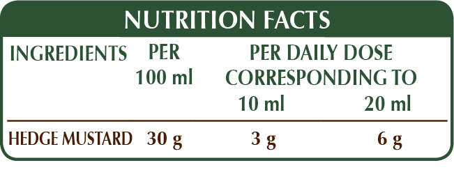 Hedge mustard enhances the upper respiratory tract function and carries out an emollient and soothing action that keeps healthy oropharyngeal mucous membranes and voice.