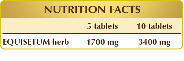 Equisetum or horsetail promotes hair and nail health, stimulating the connective tissue trophism. It also supports the drainage of body fluids and contributes to an optimally-functioning urinary tract system.