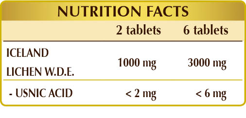 Iceland Moss (Cetraria islandica) thallus (lichen) D.W.E. (usnic acid < 0,2%), microcrystalline cellulose°, gum arabic°, silicon dioxide°°, plant-based magnesium stearate°°.