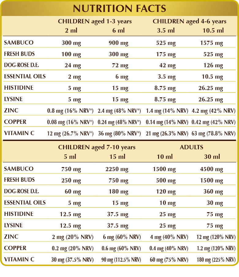 Bidistilled vegetable glycerine, mixed blossom honey (20%), elderberry (Sambucus nigra) root W.L.E., pure water, dog rose (Rosa canina) fruit D.E. (titrated to 50% vitamin C), silver fir (Abies pectinata) fresh bud W.L.E., field maple (Acer campestris) fresh bud W.L.E., white hornbeam (Carpinus betulus) fresh bud W.L.E., cedar of Lebanon (Cedrus libani) fresh bud W.L.E., juniper (Juniperus communis) fresh sprout W.L.E., hazelnut (Corylus avellana) fresh bud W.L.E., black alder (Alnus glutinosa) fresh bud W.L.E., dwarf pine (Pinus montana) fresh bud W.L.E., blackcurrant (Ribes nigrum) fresh bud W.L.E., dog rose (Rosa canina) fresh sprout W.L.E., zinc gluconate, (L-)histidine, (L-)lysine; natural sweeteners: steviol glycosides and thaumatin; niaouli (Melaleuca leucadendron var. viridiflora) leaf E.O., eucalyptus (Eucalyptus globulus) leaf E.O., cajeput (Melaleuca leucadendron var. cajaputi) leaf O.E., Scots pine (Pinus sylvestris) needle and bud E.O., tea tree (Melaleuca alternifolia) top E.O., copper gluconate.