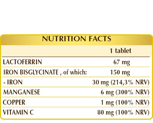 Food supplement based on ferrous bisglycinate, a source of iron in a chelated organic form with high bioavailability, well tolerated by the body, combined with supportive nutrients. Iron contributes to the normal formation of red blood cells and hemoglobin, supporting the regular transport of oxygen in the body. It is involved in the process of cell division, supports normal cognitive function, and together with manganese and vitamin C, promotes normal energy metabolism. Additionally, in combination with copper and vitamin C, it supports the immune system function. Furthermore, copper contributes to the normal transport of iron in the body, while vitamin C enhances its absorption.