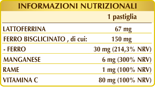 Bisglicinato ferroso, vitamina C (acido ascorbico), lattoferrina da latte vaccino, cellulosa microcristallina°, manganese gluconato, gomma arabica°, magnesio stearato di origine vegetale°°, silicio biossido°°, rame gluconato.