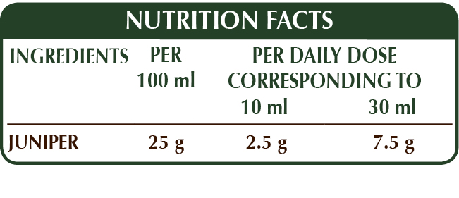 Food supplements should not be used as a substitute for a varied and balanced diet and should be consumed as part of an overall healthy lifestyle. Do not exceed the recommended daily dose. Keep the product out of reach of children younger than 3 years of age. It contains juniper fruits (cones): do not use for prolonged periods without hearing your doctor’s advice. Do not use in case of renal dysfunction.