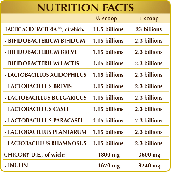 Chicory (Cichorium intybus) root D.E. (Standardized to 90% inulin), corn or rice-based maltodextrins, a mix of gastro-resistant live lactic acid bacteria* (standardized to 10% in each of the following strains: Bifidobacterium bifidum SD5215, breve SD5206, lactis SD5219; Lactobacillus acidophilus SD5212, brevis SD5214, bulgaricus SD5589, casei SD5213, paracasei SD5275, plantarum SD5209, rhamnosus SD5217).