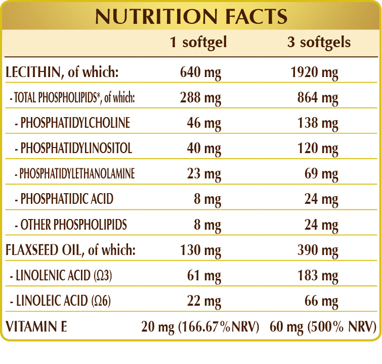 Sunflower (Helianthus annuus) certified non-GMO seed lecithin (standardized with 45% phospholipids), flax (Linum usitatissimum) seed oil, natural source vitamin E (D-α-tocopherol); excipients (softgels). Food-grade gelatin and glycerine.