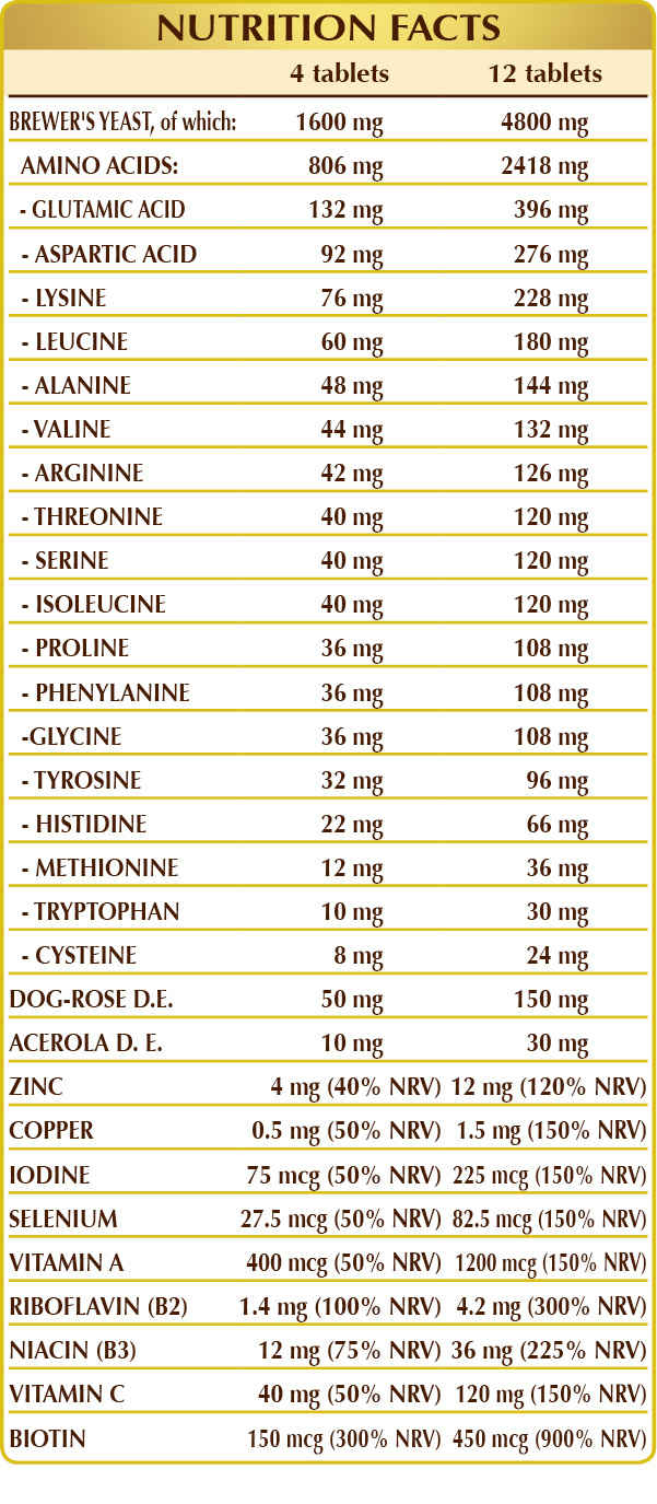 Food supplement containing brewer's yeast, minerals and vitamins. Zinc, iodine, vitamins A, B2, B3, C and biotin help maintain healthy skin. Zinc, selenium and biotin can help you keep healthy hair whereas copper contributes to the normal pigmentation of skin and hair.