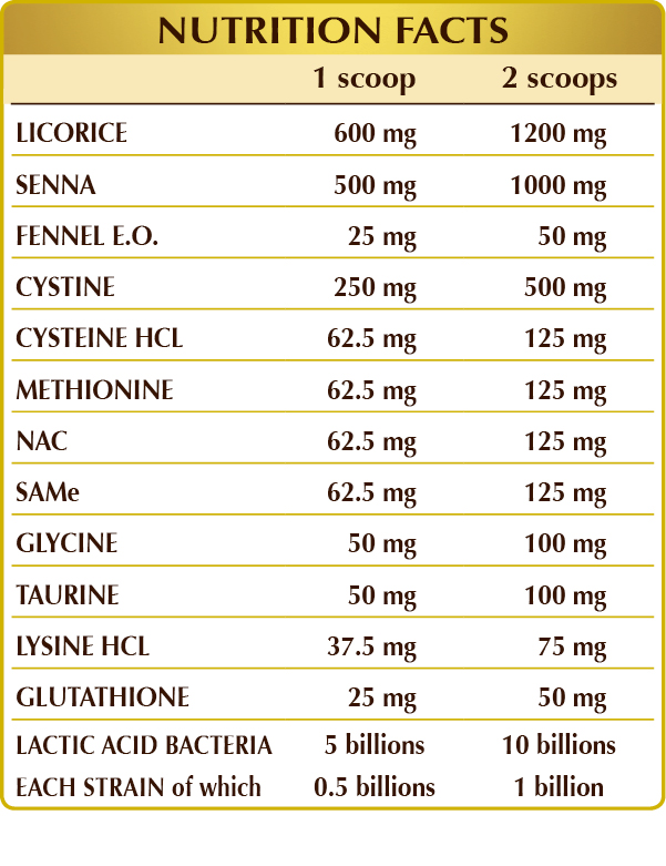 Fructose, licorice (Glycyrrhiza glabra) roots, senna (Cassia angustifolia) leaves, microcrystalline cellulose, gum arabic, (L-)cystine, (L-)cysteine, (L-)methionine, NAC (N-acetylcysteine), SAMe (S-adenosil methionine), glycine, taurine, (L-)lysine, fennel (Foeniculum vulgare) O.E, fruits, glutathione biosside, lattice fermentation mixture (titrated at 10% in any of the following ATCC chips: Bifidobacterium bifidum SD5215, Bifidobacterium breve SD5206, Bifidobacterium lactis SD5219; Lactobacillus acidophilus SD5212, Lactobacillus brevis SD5214, Lactobacillus bulgaricus SD5589, Lactobacillus casei SD5213, Lactobacillus paracasei SD5275, Lactobacillus plantarum SD5209, Lactobacillus rhamnosus SD5217).
