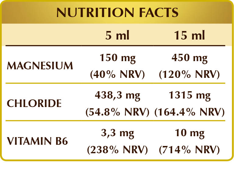 Water, glycerin, magnesium chloride hexahydrate; sweeteners of natural origin: erythritol, steviol glycosides from stevia, thaumatin; activated vitamin B6 (pyridoxal 5-phosphate).