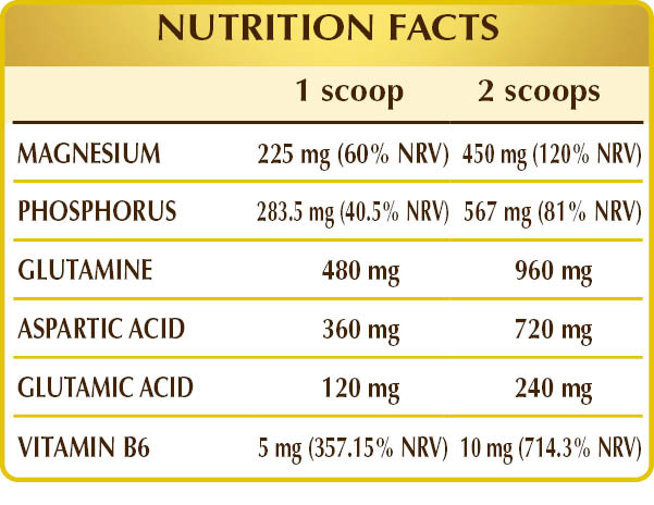 Magnesium glycerophosphate, corn or rice-derived maltodextrins, (L-)glutamine, (L-)aspartic acid, citric acid, (L-)glutamic acid, potassium citrate, magnesium citrate dibasic, vitamin B6 (pyridoxal -5-phosphate); natural sweeteners: steviol glycosides and thaumatin.