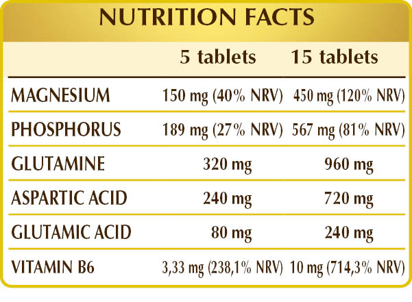 Food supplement containing magnesium and amino acids. It takes part in cell division processes and may enhance electrolyte balance, protein synthesis and normal muscle function. Combined with vitamin B6, it contributes to a properly functioning nervous system, supports normal psychological functions, promotes energy metabolism and helps to combat tiredness and fatigue. Moreover, in combination with phosphorus, it keeps your bones and teeth healthy.