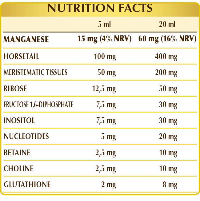 Bidistilled vegetable glycerine, pure water, magnesium citrate; freshly meristematic tissues: hawthorn (Crataegus oxyacantha, or Crataegus monogyna ) young shoots, raspberry (Rubus idaeus ) young shoots, bloody (Cornus sanguinea) buds, blackthorn (Prunus spinosa) buds; magnesium gluconate, magnesium tartrate, ribose, fructose 1,6-diphosphate, inositol, betaine citrate, tartrate choline; nucleotide blend: AMP (adenosine monophosphate), CMP (cytosine monophosphate), GMP (guanosine monophosphate), UMP (uridine monophosphate); glutathione; natural sweetener: thaumatin (E957). Sweetened only with natural sweeteners.