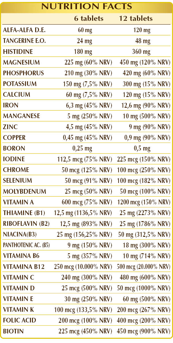 Magnesium glycerophosphate, dibasic potassium phosphate, dibasic calcium phosphate, microcrystalline cellulose°, vitamin C (ascorbic acid), magnesium oxide, gum arabic°, (L-)histidine, dibasic magnesium citrate, plant-derived vitamin E (D-α-tocopheryl acetate), alfalfa or lucerne (Medicago sativa) flowering herb D.E., silicon dioxide°°, ferrous gluconate, manganese gluconate, zinc gluconate, vitamin B3 (niacinamide), mandarin (Citrus reticulata) fruit peel E.O., naturally derived magnesium stearate°°, vitamin B1 (thiamine hydrochloride), activated vitamin B2 (riboflavin 5-phosphate sodium), vitamin B5 (calcium pantothenate), lichen (Cladonia rangiferina) thallus D.E. (standardized to vitamin D3 cholecalciferol 100,000 IU/g), activated vitamin B6 (pyridoxal-5-phosphate), sodium borate, vitamin A (retinyl acetate), copper sulfate, chromium picolinate, activated vitamin B12 (5-deoxyadenosylcobalamin, methylcobalamin), biotin, activated folic acid (L-methylfolate calcium), potassium iodide, sodium selenite, vitamin K1 (phylloquinone), sodium molybdate. °Bulking agent. °°Anti-caking agent