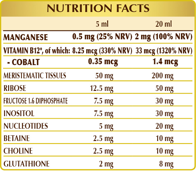 Bidistilled vegetable glycerine, pure water; fresh meristematic tissues: chestnut (Castanea vesca, or Castanea sativa) buds, horse chestnut (Aesculus hippocastanum) buds (without escin), black poplar (Populus nigra) buds, ribose, fructose 1.6 diphosphate; acidity regulator: citric acid; inositol, betaine citrate, tartrate choline; nucleotide mix: AMP (adenosine monophosphate), CMP (cytosine monophosphate), GMP (guanosine monophosphate), UMP (uridine monophosphate); manganese gluconate, reduced glutathione; natural-origin sweetener: thaumatin; activated vitamin B12 (5-deoxyadenosylcobalamin, methylcobalamin). With natural sweeteners.