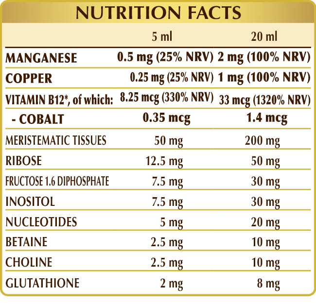 Bidistilled vegetable glycerine, pure water; fresh meristematic tissues: chestnut (Castanea vesca, or Castanea sativa) buds, horse chestnut (Aesculus hippocastanum) buds (without escin), black poplar (Populus nigra) buds, ribose, fructose 1.6 diphosphate; acidity regulator: citric acid; inositol, betaine citrate, tartrate choline; nucleotide mix: AMP (adenosine monophosphate), CMP (cytosine monophosphate), GMP (guanosine monophosphate), UMP (uridine monophosphate); manganese gluconate, reduced glutathione; natural sweetener: thaumatin, vitamin B12 (cyanocobalamin). Sweetened only with natural sweeteners.