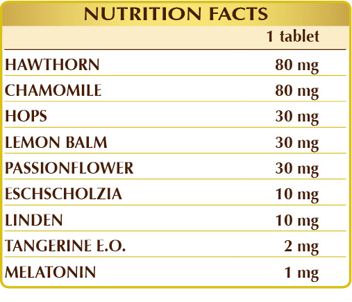 Hawthorn (Crataegus oxyacantha) flower and leaf Pulv., German chamomile (Matricaria chamomilla) flower head Pulv., microcrystalline cellulose°, gum arabic°, hops (Humulus lupulus) strobile (female flower) Pulv., lemon balm (Melissa officinalis) leaf Pulv., passionflower (Passiflora incarnata) flowering herb Pulv., silicon dioxide°°, California poppy (Eschscholtzia californica) herb Pulv., linden (Tilia platyphyllos) flower Pulv., tangerine (Citrus reticulata) fruit peel E.O., melatonin, plant-derived magnesium stearate°°.