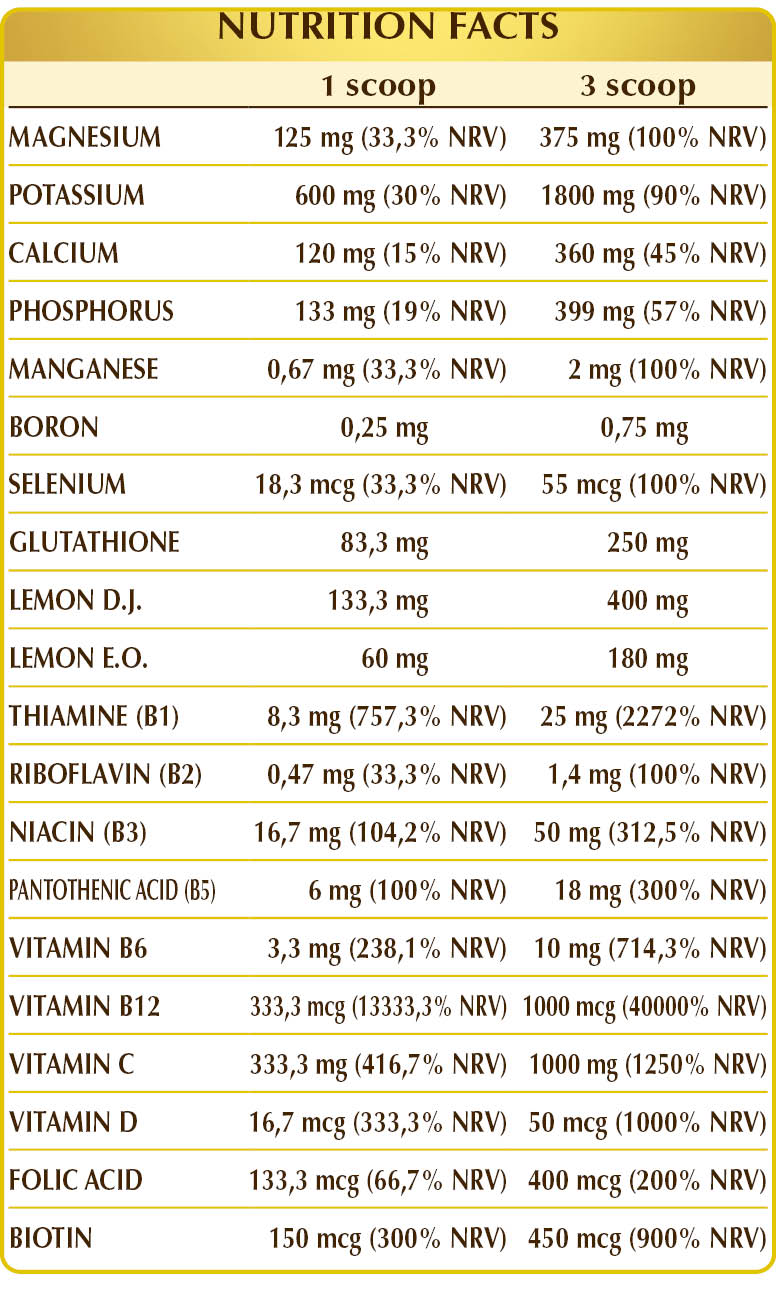 Corn and rice-derived maltodextrins, potassium citrate, dibasic magnesium citrate, calcium glycerophosphate, magnesium glycerophosphate, vitamin C (ascorbic acid), magnesium gluconate, magnesium pidolate, potassium gluconate, lemon (Citrus limon) fruit D.J., reduced glutathione; natural flavouring: lemon (Citrus limon) fruit zest E.O.; vitamin B3 (nicotinamide), vitamin B1 (thiamine hydrochloride), vitamin B5 (calcium pantothenate), lichen (Cladonia rangiferina) thallus D.E. (standardized to vitamin D3 cholecalciferol 100,000 IU / g), manganese gluconate, activated vitamin B6 (pyridoxal 5-phosphate); natural sweeteners: steviol glycosides from stevia, thaumatin; sodium borate, activated vitamin B2 (riboflavin 5-sodium phosphate), activated vitamin B12 (5-deoxyadenosylcobalamin and methylcobalamin), biotin, activated folic acid (calcium L-methylfolate), sodium selenite. D.E.= Dehydrated Extract